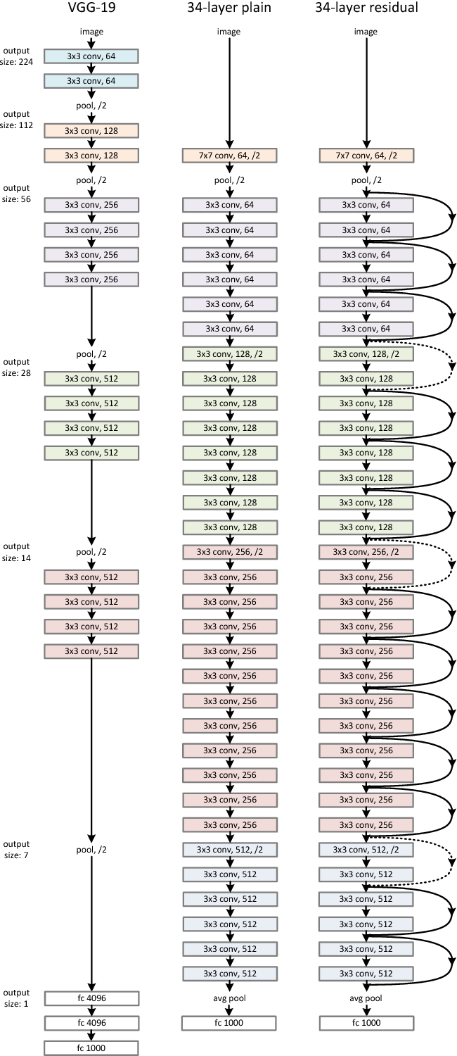ResNet 의 구조는 위 그림고 같습니다. ResNet 의 baseline 은 VGG net 에 영향을 받았습니다. 맨 오른쪽 Skip Connection 이 있는 구조가 ResNet 구조입니다.